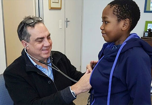 Cardiac and transplant surgeon Dr Willie Koen with ten-year-old Philasande Dladla of Johannesburg at Netcare Christiaan Barnard Memorial Hospital in Cape Town. In May 2016, Philasande became the first child on the African continent to have a HeartWare ventricular assist device (HVAD) mechanical heart implanted to enable his damaged heart to continue functioning.